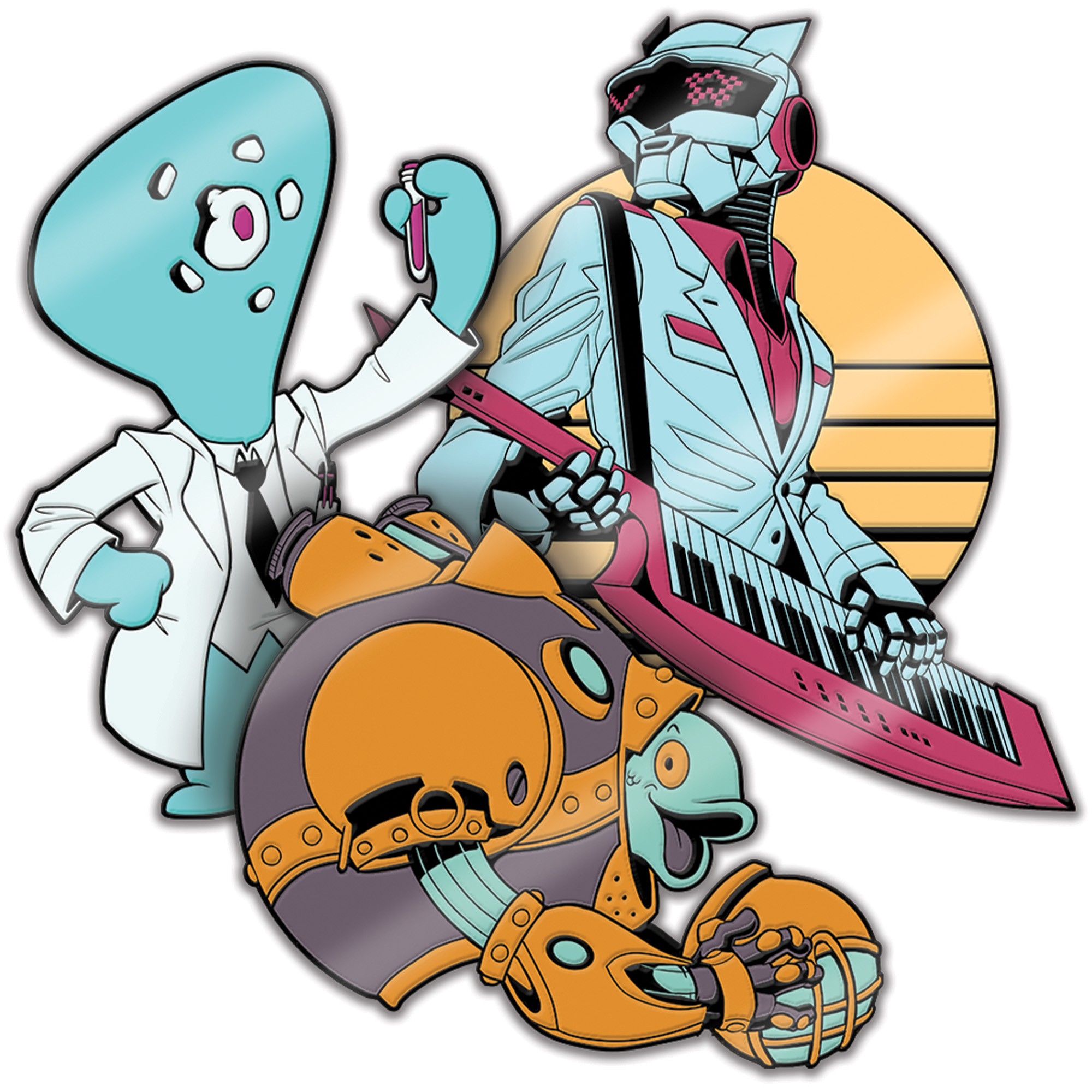 This pack of three colorful enamel pins features some of your favorite characters from the Dark Matter universe: an amoeboid scientist, a cyberwave bard, and a nautilid! These pins are high-quality with metal backing and beautiful enamel colors.