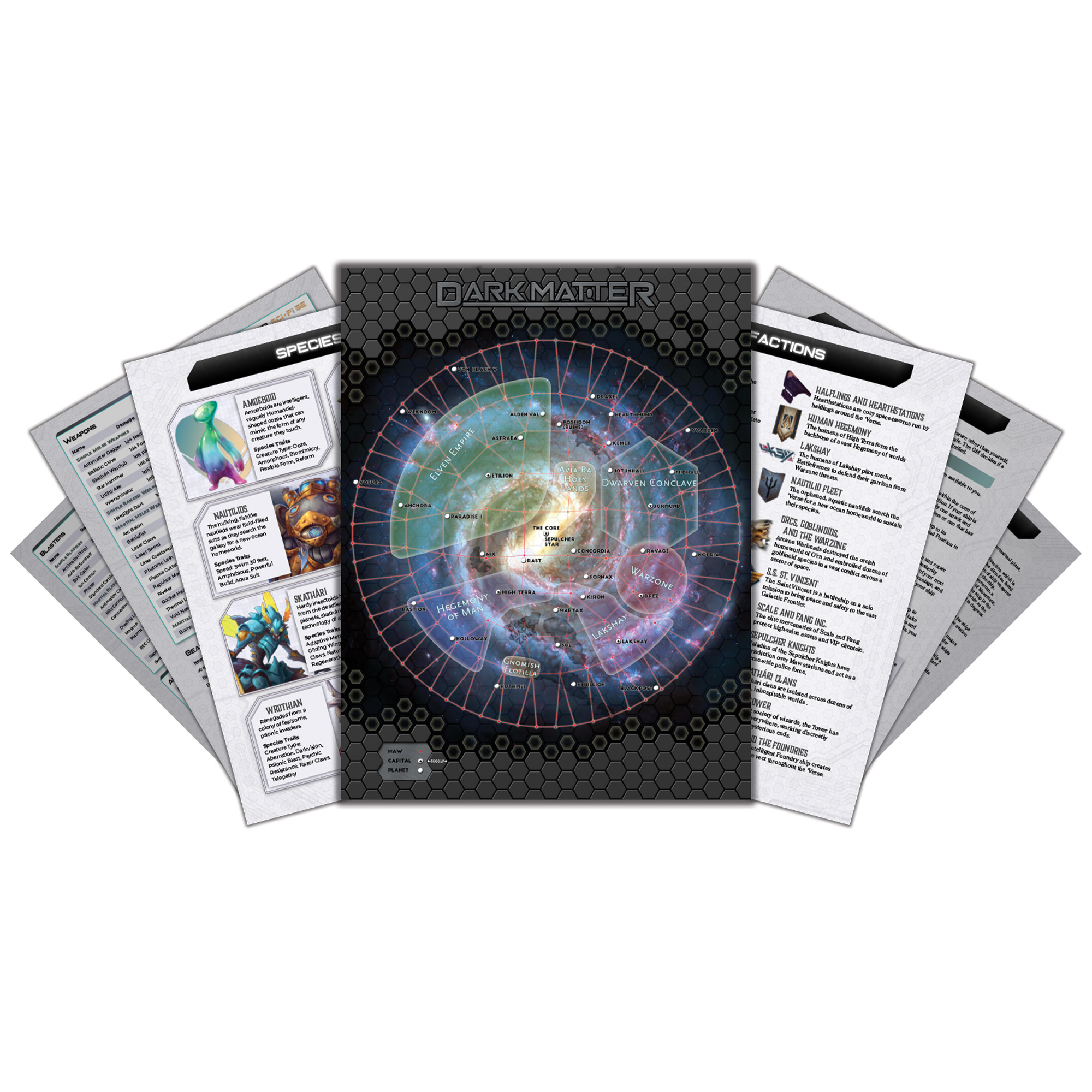Dark Matter is a 440+ page sci-fantasy campaign setting that launches your D&D 5E game into space! Gather your crew, build your starship, face down alien horrors, and explore the farthest reaches of the galaxy. Using the 2024 5.5E rules, you can break free from medieval fantasy and live out Dune, Star Wars, or Mass Effect at your tabletop!